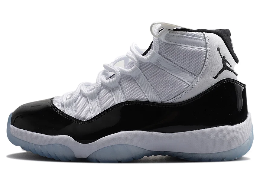 Air Jordan 11 de color blanco y negro con puntera y alrededores de cherol.